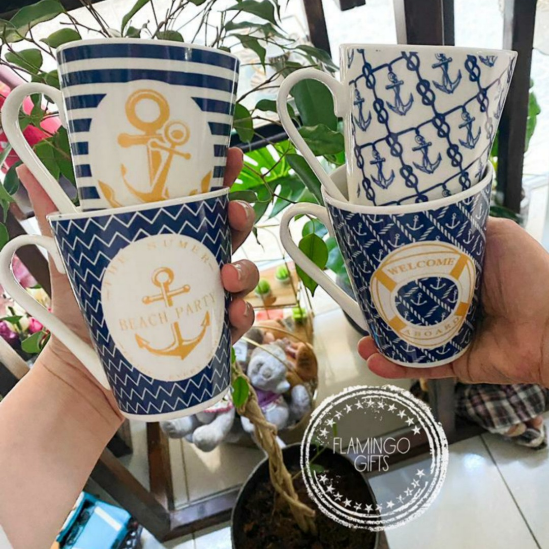 ماغات البحارة أشكال متنوعة اللون الأبيض والأزرق أساسي لهذه الماغات مع رسومات أشكال البحرية المختلفة (مرساة- عجلة قيادة- ودولاب انقاذ)